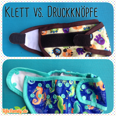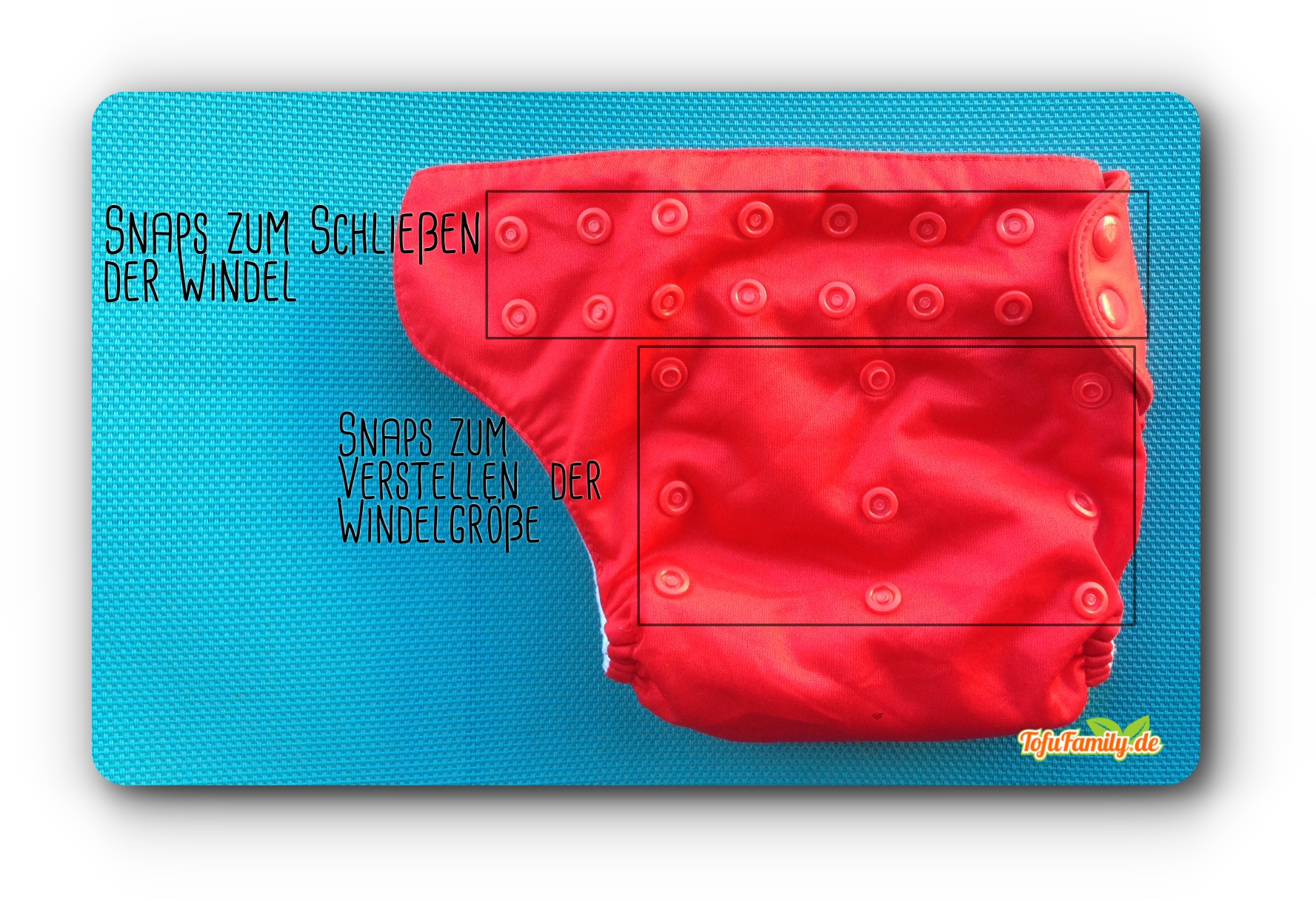 Eine rote Stoffwindel. Zwei Reihen mit Snaps dienen dem Schließen der Windel, darunter drei Reihen mit Snaps zur Größenregulierung der Stoffwindel