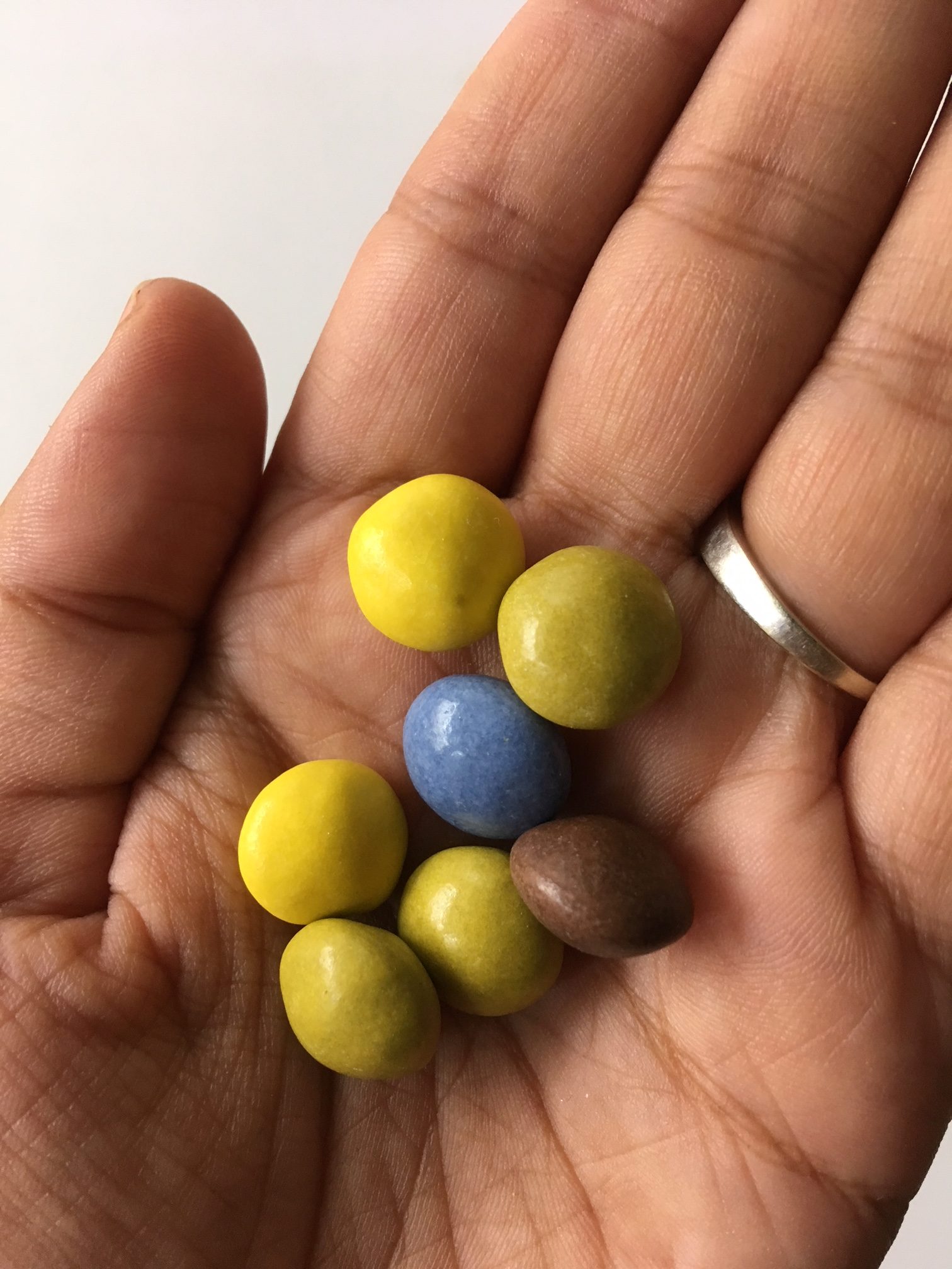 gelbe, braune und blaue Schokolinsen in einer Handfläche